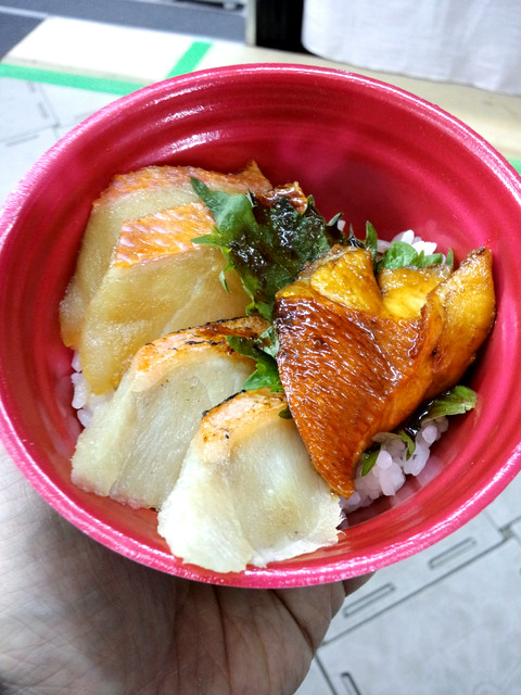 金目鯛を湯引き・炙り・煮付けにしたものを載せた丼。