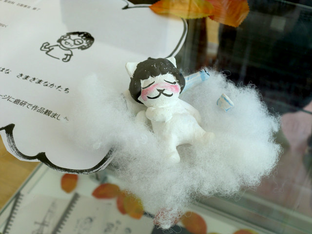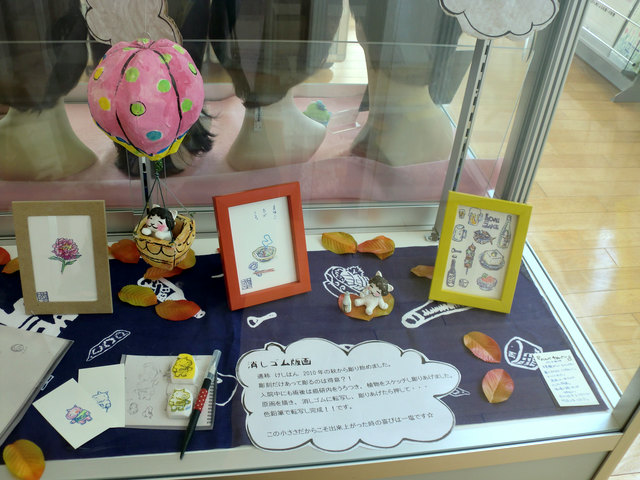 消しゴム版画に着色したものと、石粉粘土で作ったオリジナルキャラクター「ハナネコ」が展示されています。