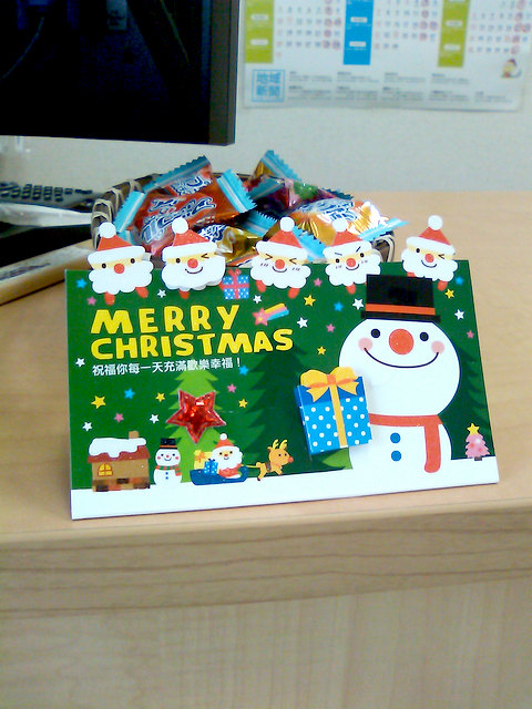 ↑こちらは次女から。サンタさんがいっぱい!画像ではわかりにくいのですが、一部立体的な作りになっているのがアクセントになっています。メッセージが中国語なのが台湾らしいところですね。