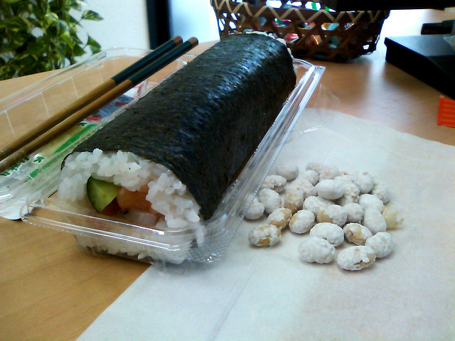 今年の吉方位は南南東やや右。なんとな~くそっち方向に向きながら、ひたすら無言で恵方巻きをいただきました。最近寿司っぽいものはご無沙汰だったのでおいしかった~!