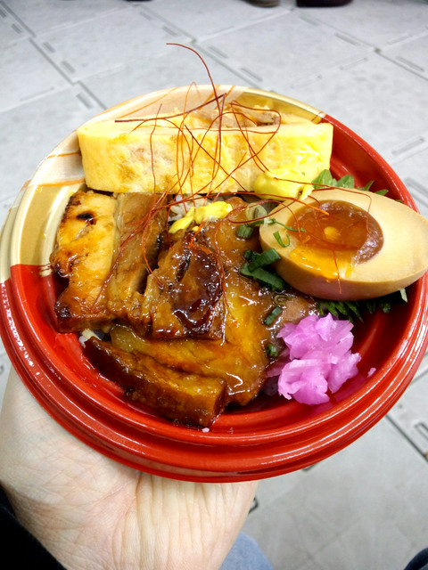 黒豚の角煮・炙った角煮・中に角煮の入っただし巻き玉子焼き・煮玉子の載った丼。